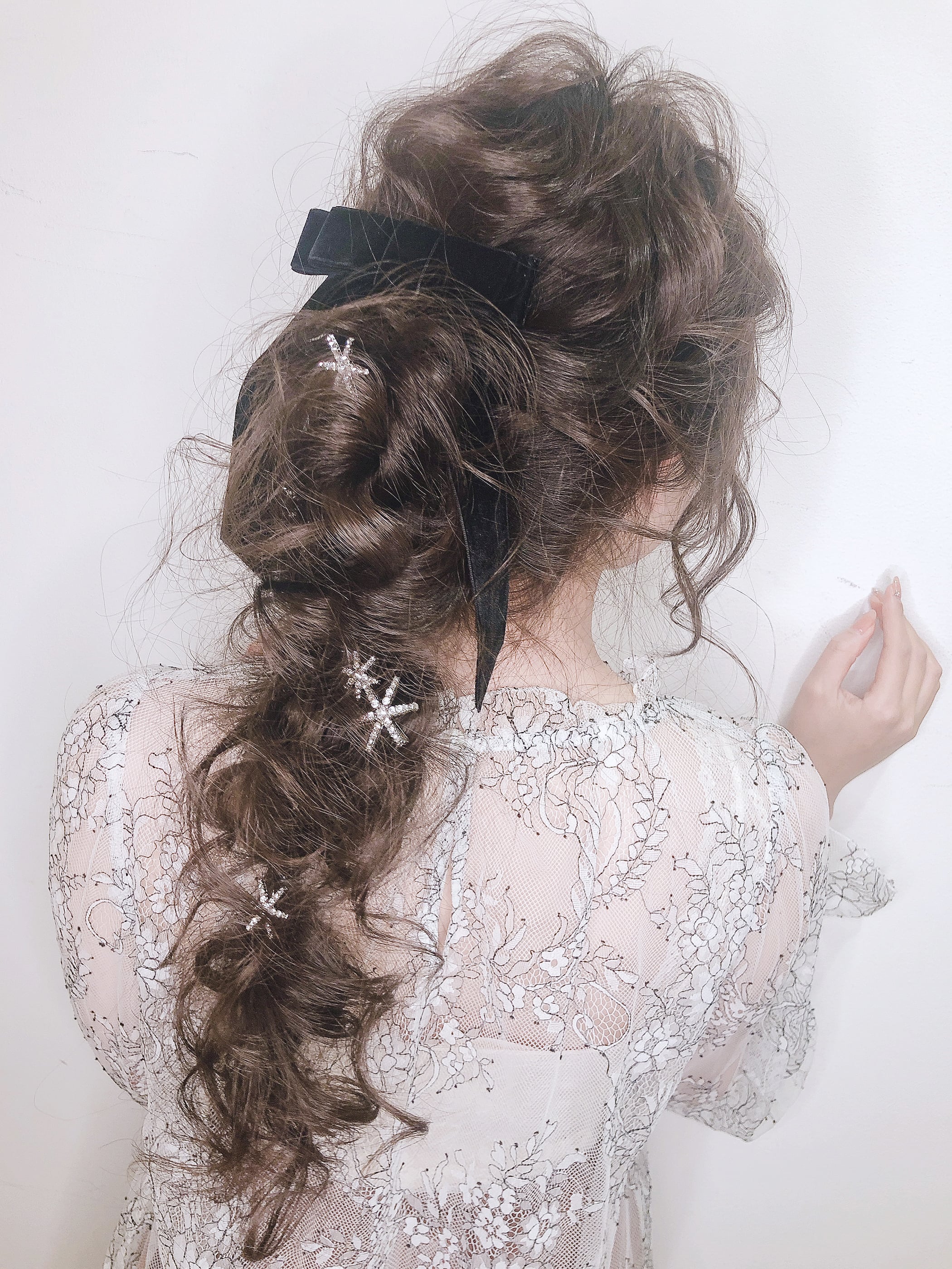 編みおろしヘアに散りばめても、ゆるいアップヘアやポニーテールのポイントにしても◎ゆるく巻いた華やかなダウンヘアに合わせても可愛いです。