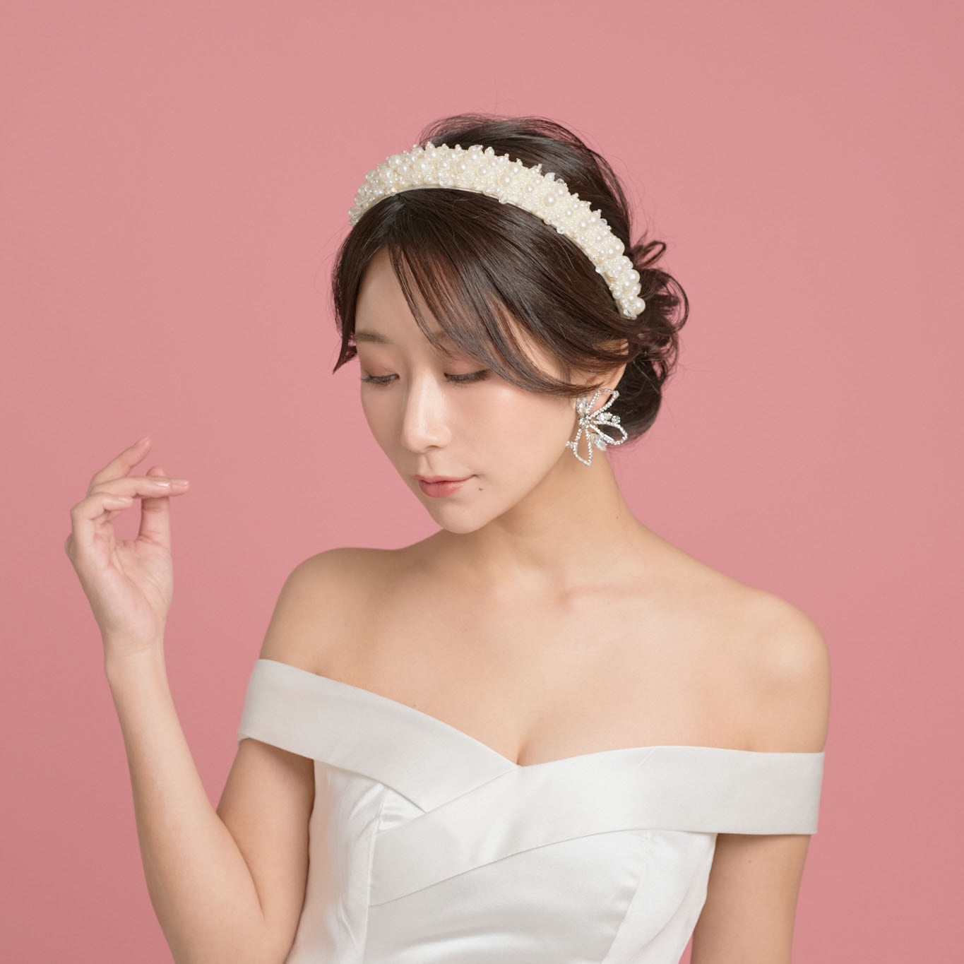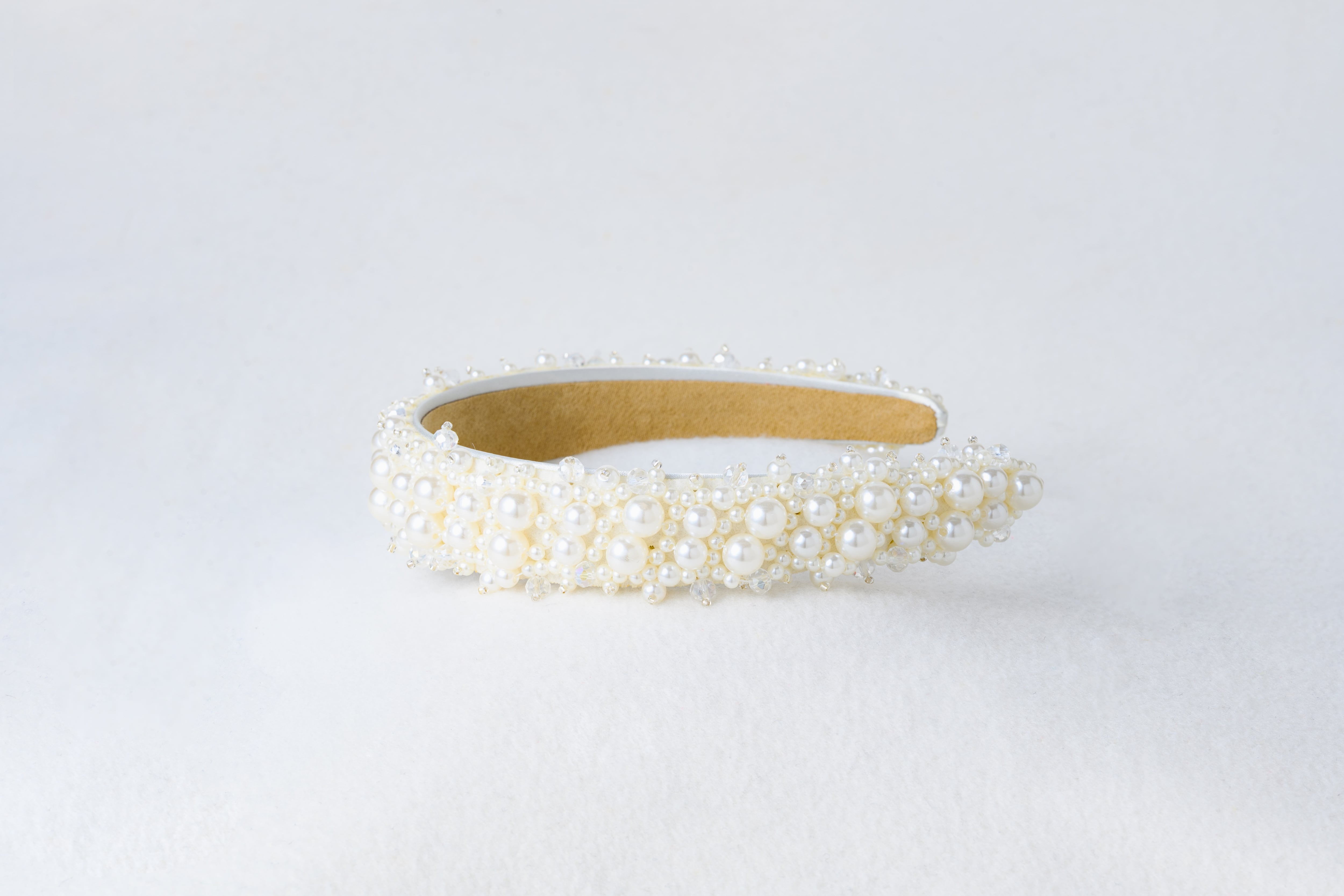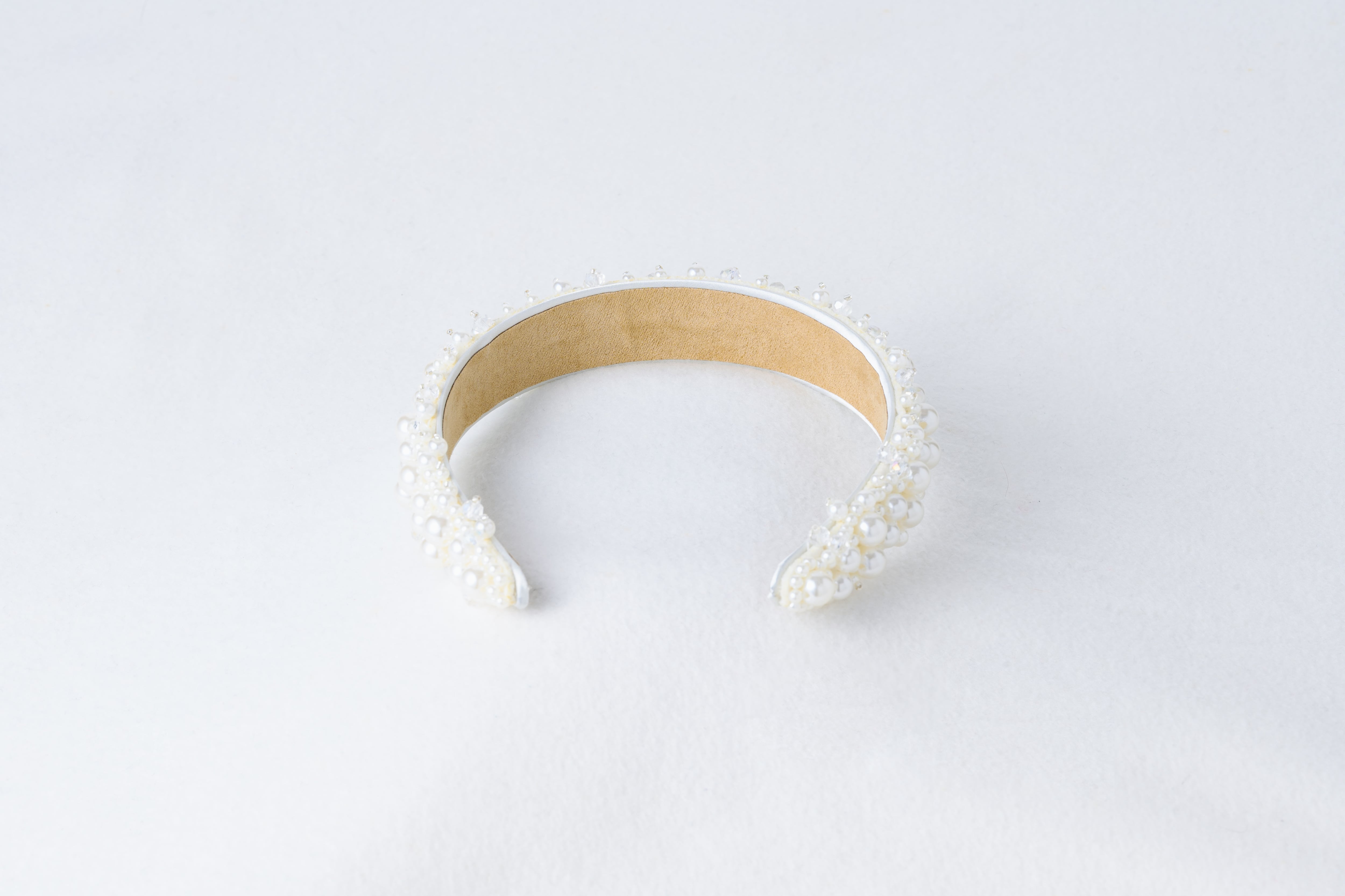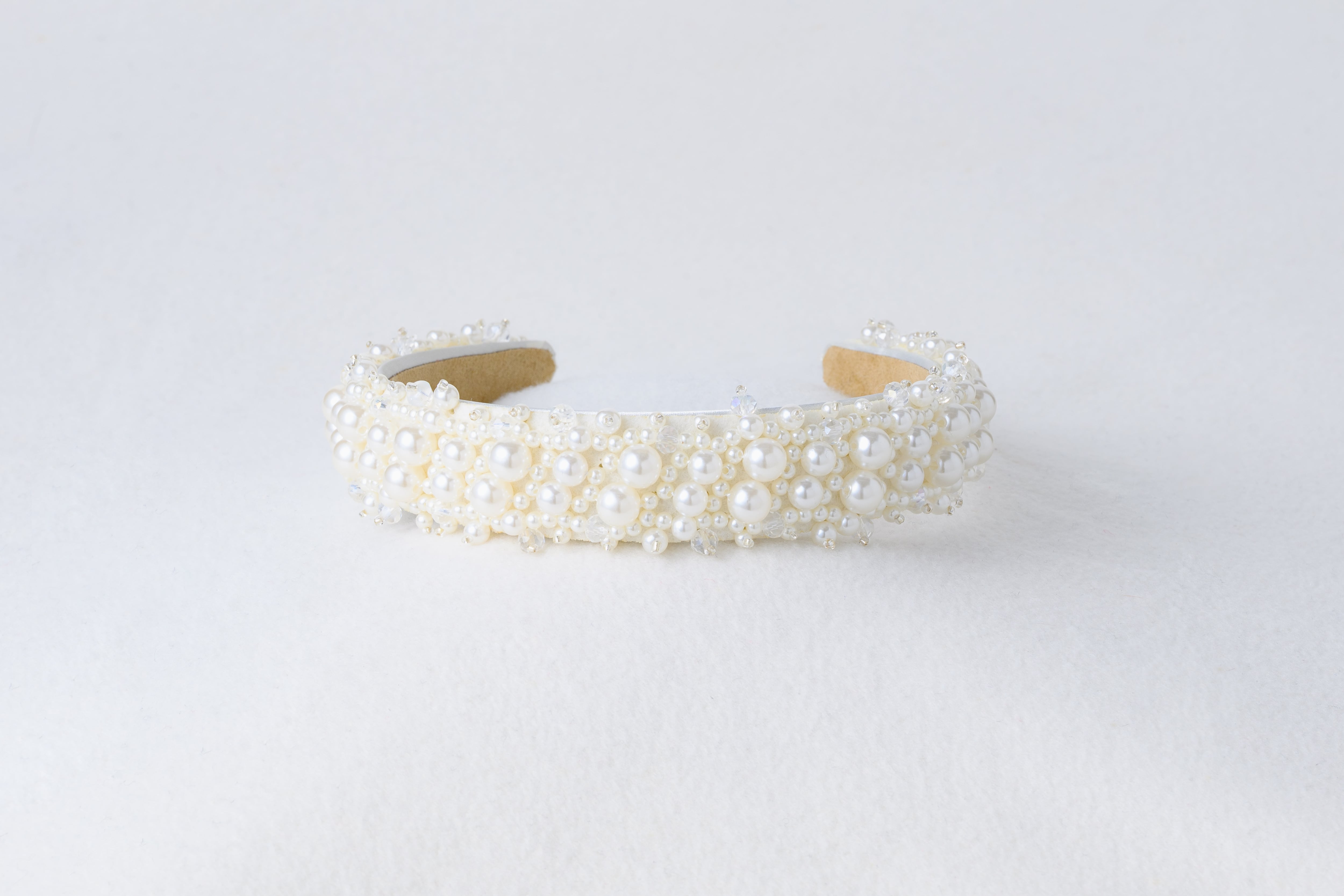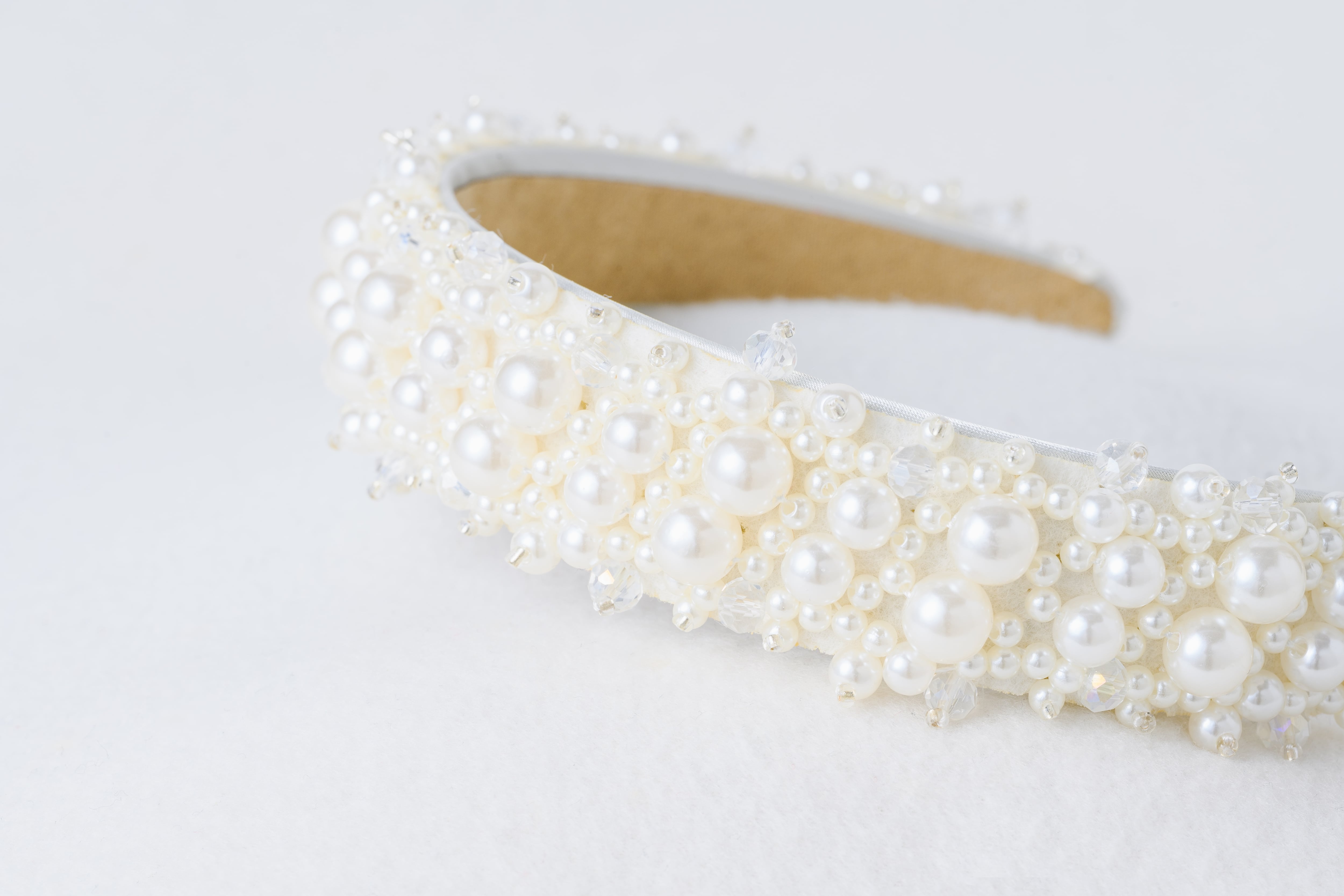 大小のパールがリズミカルに並んだモードなデザインのブライダルカチューシャです。