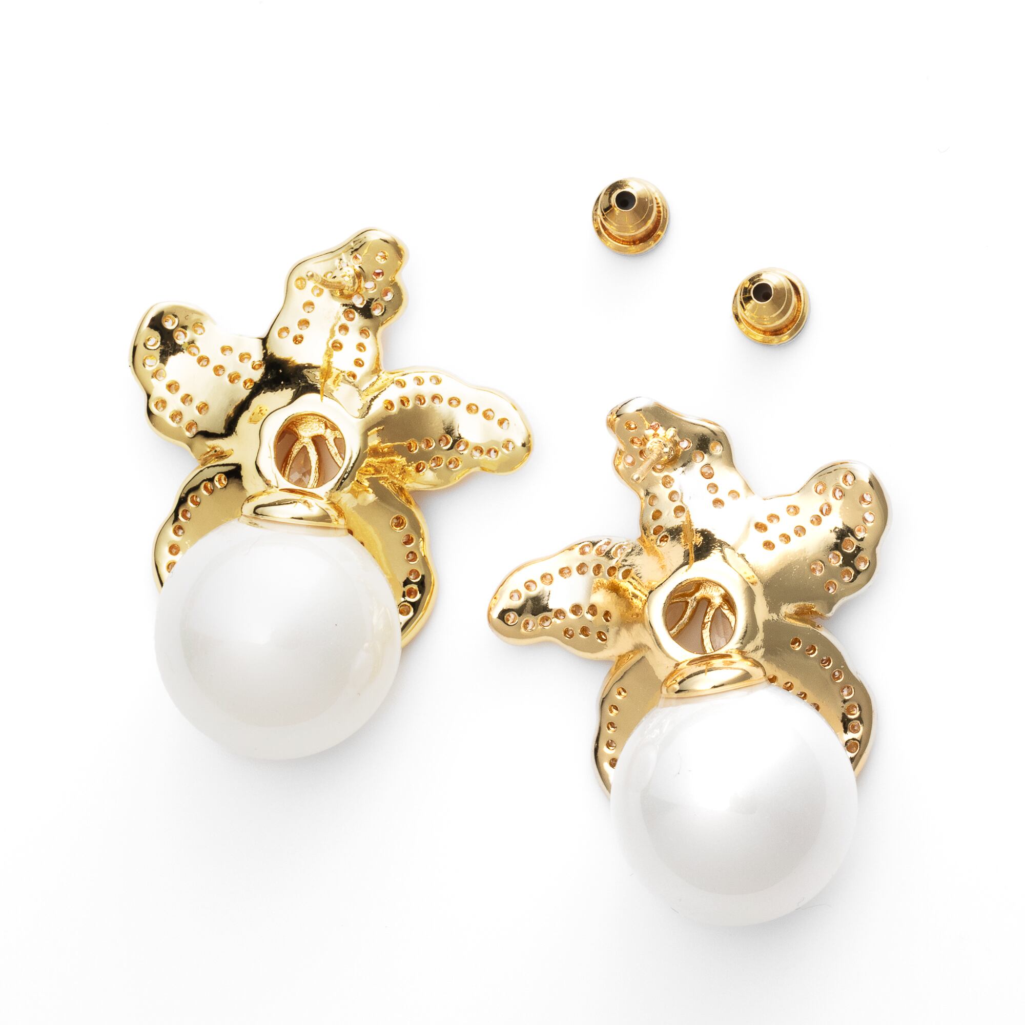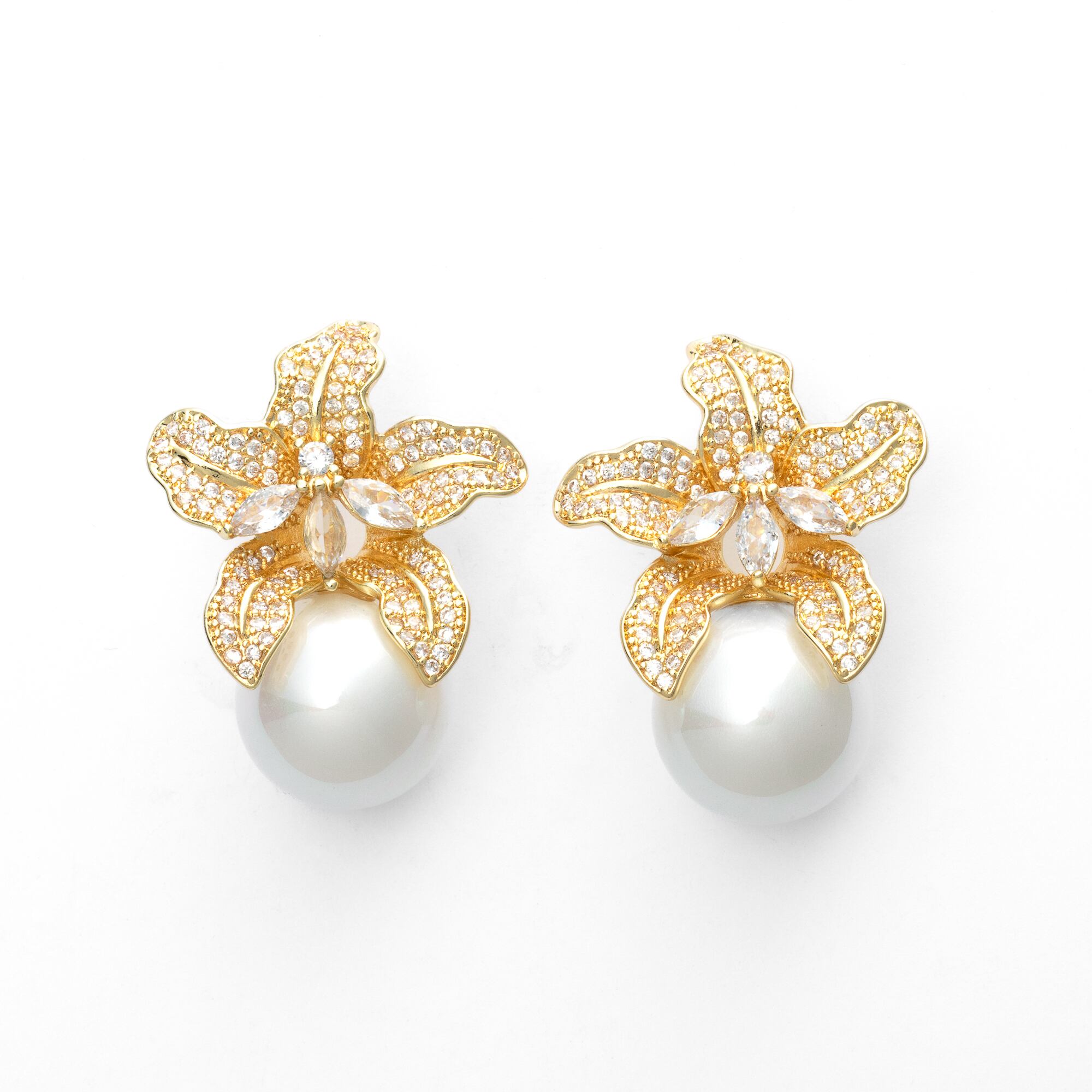 大小の繊細なキュービックジルコニアが敷き詰められたユリのようなフラワーモチーフは、きらきらと輝いてお顔周りを華やかに引き立てます。
