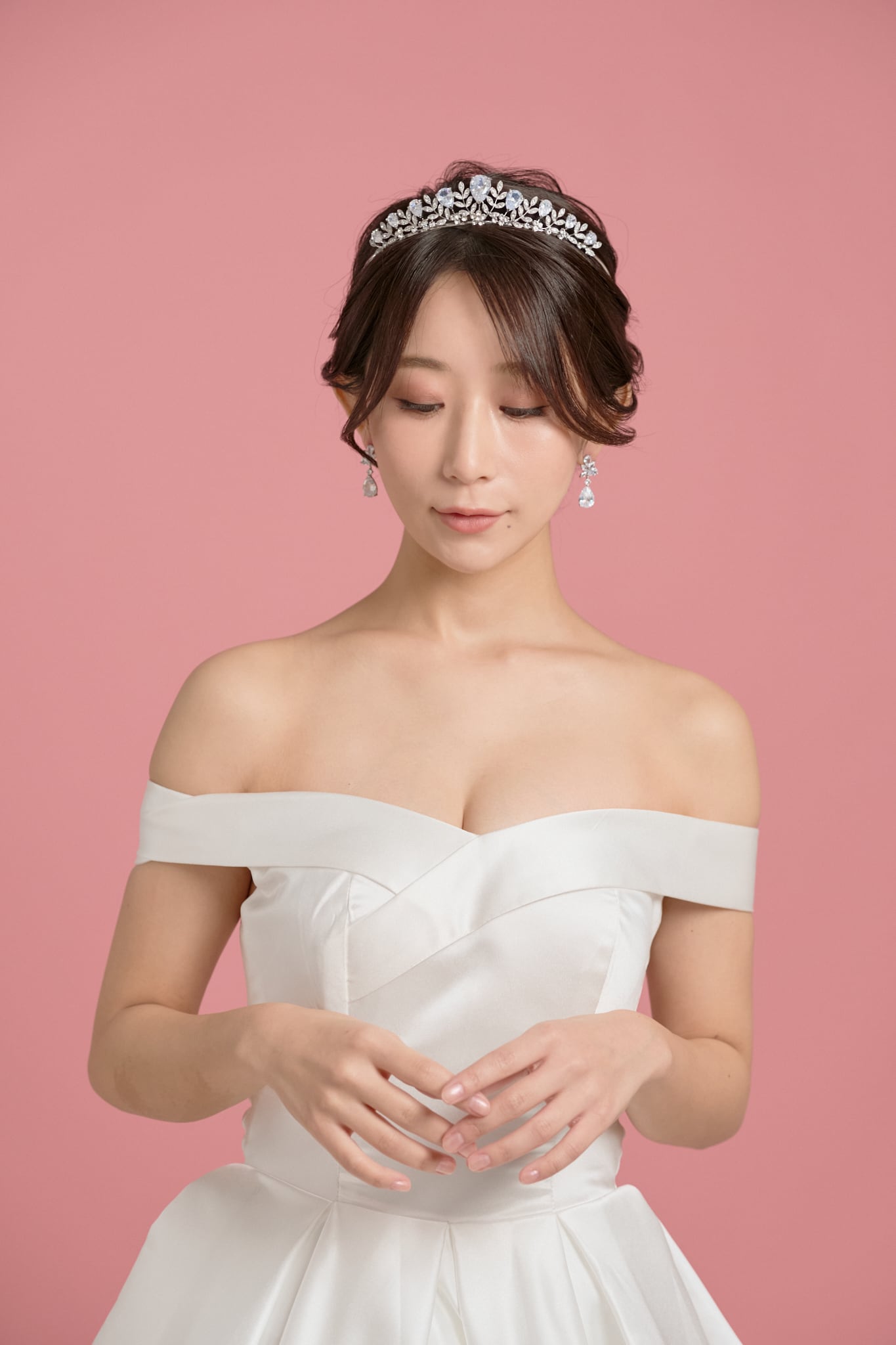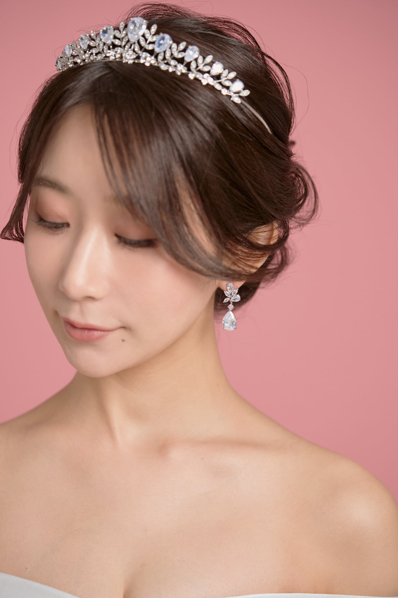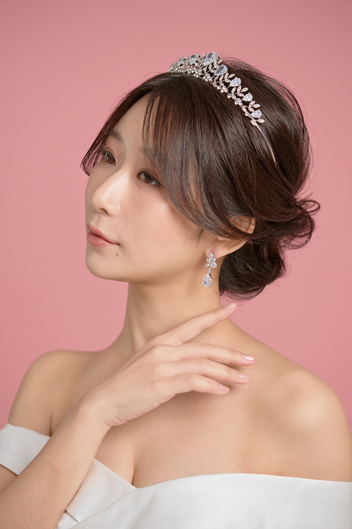 ティアラや、同じキュービックジルコニアを使ったアイテムで合わせるのがおすすめです。