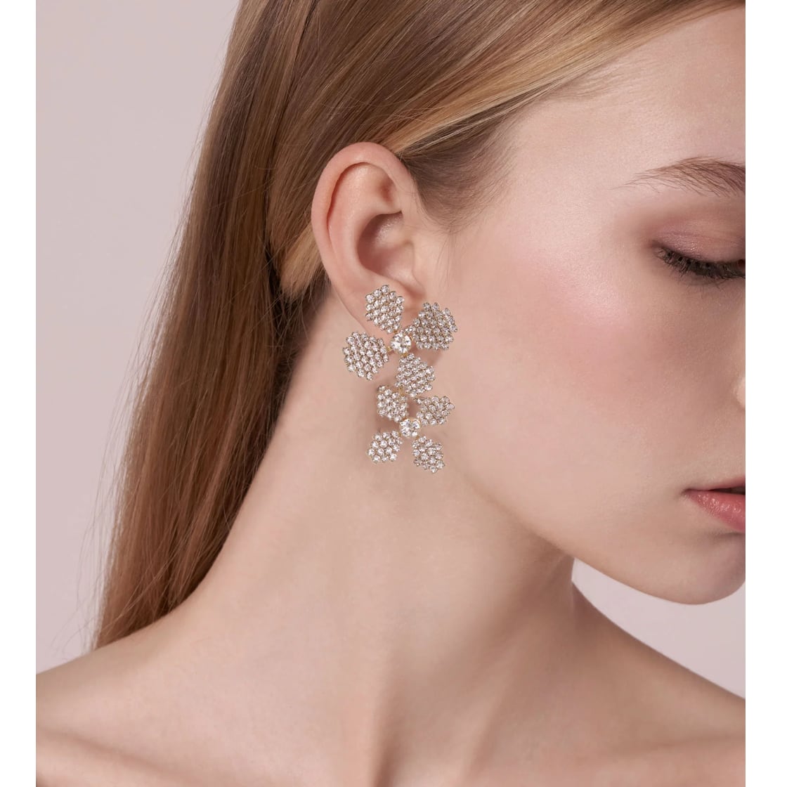 100個以上のスワロフスキークリスタルが爪留めされた立体的なフラワーモチーフを連ねて。