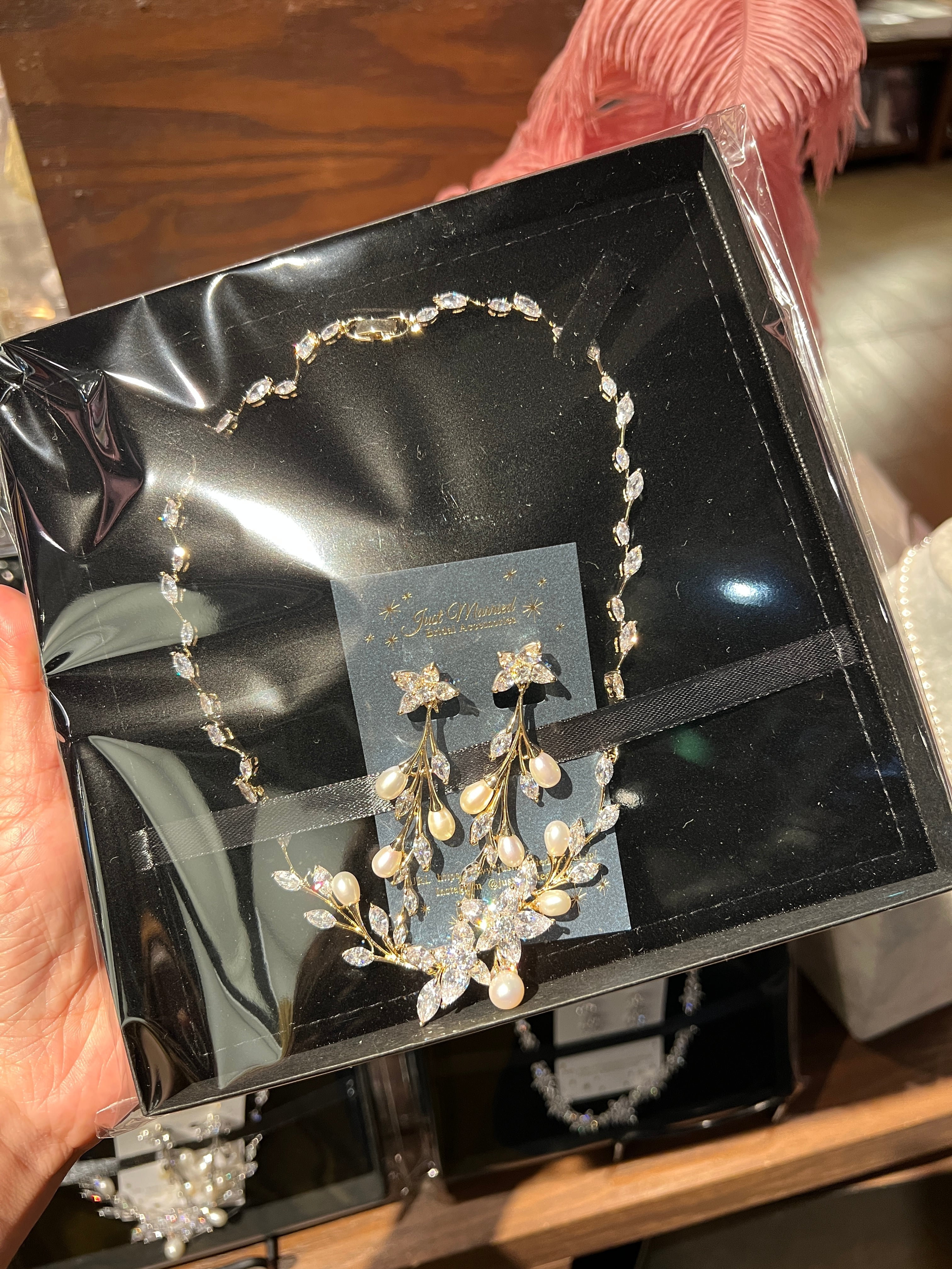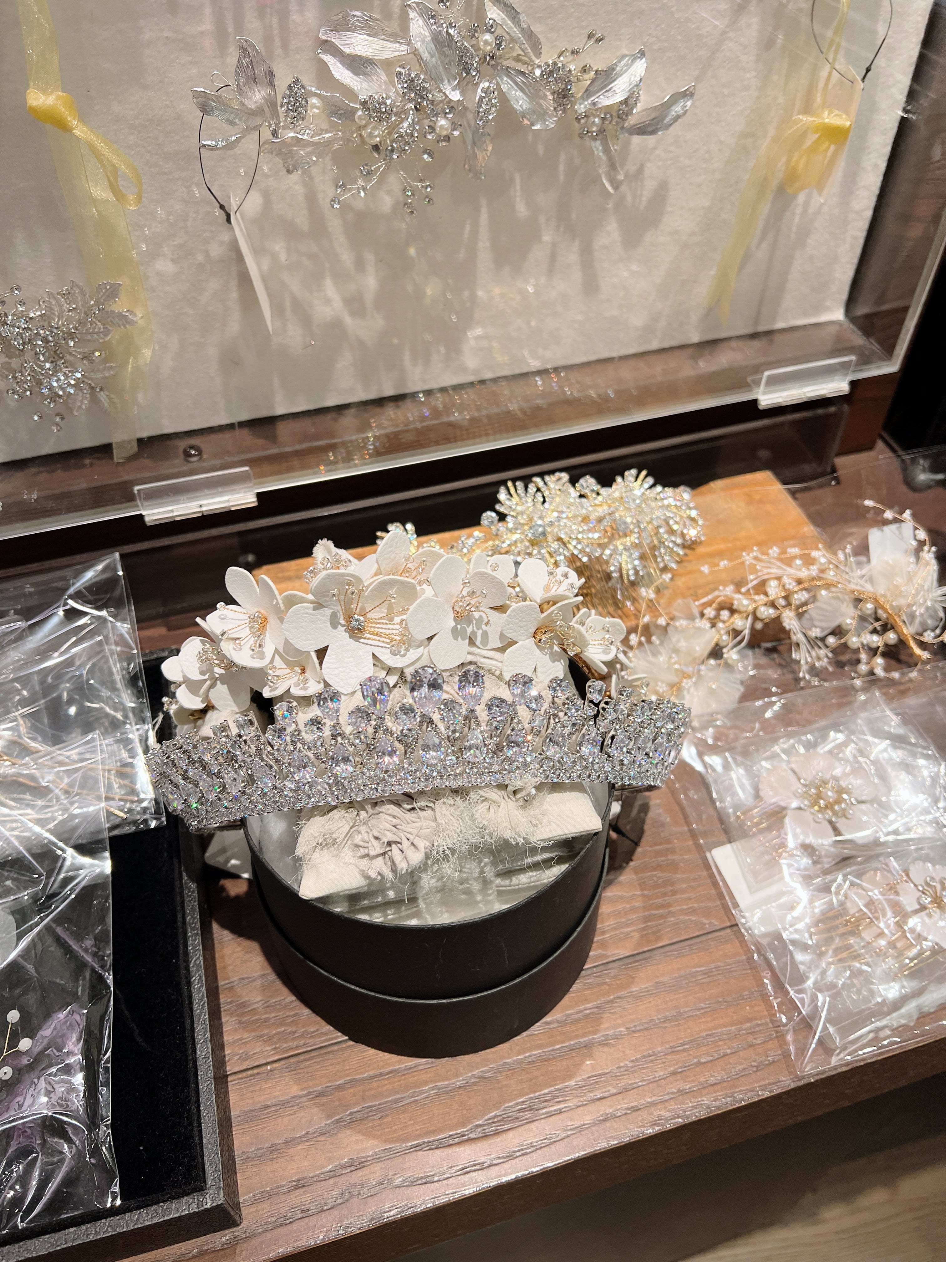 常設店舗では、ヘッドドレスやティアラ、ブライダルピアスやネックレスなど当店の人気商品を中心に販売いたします。