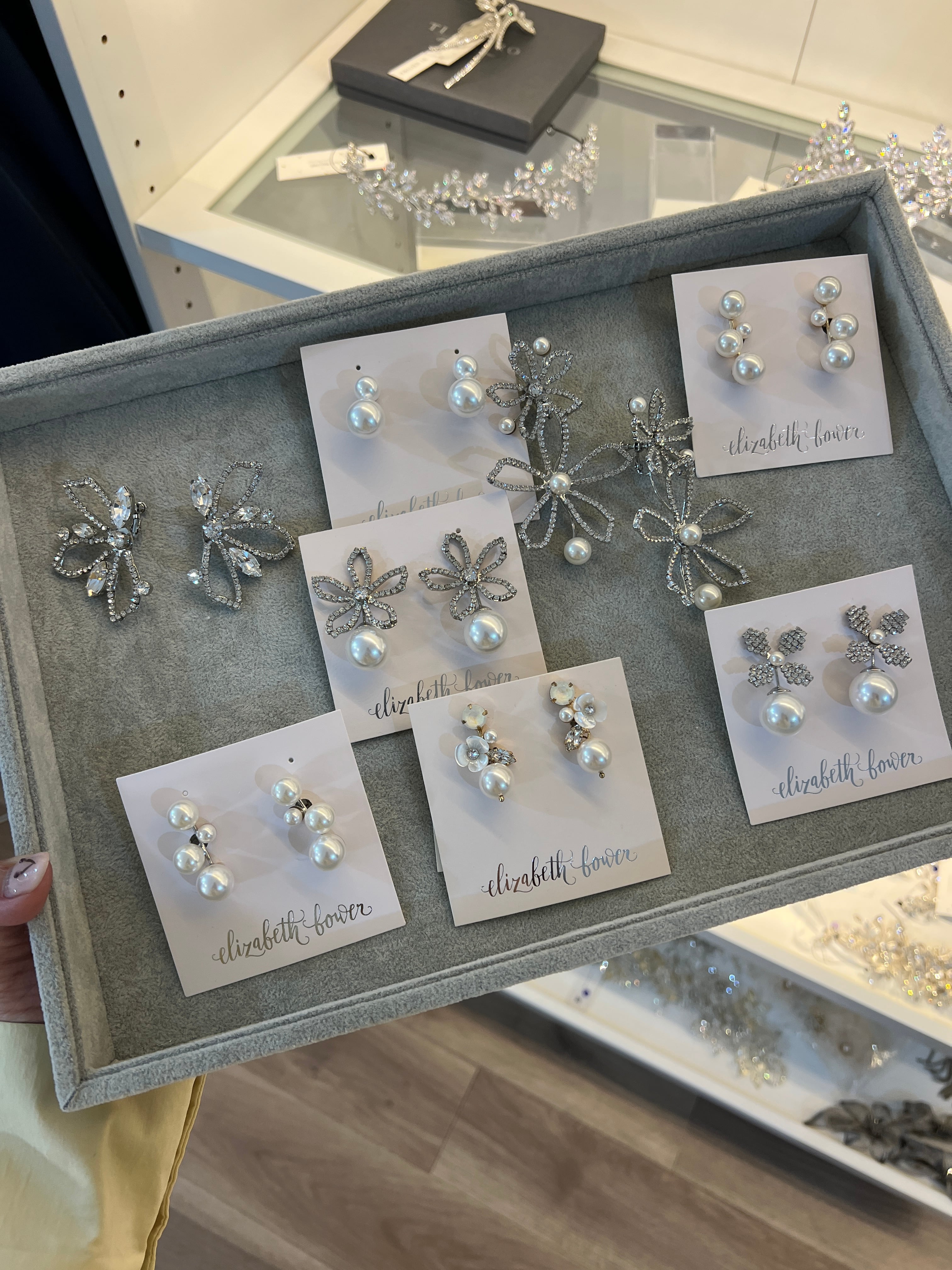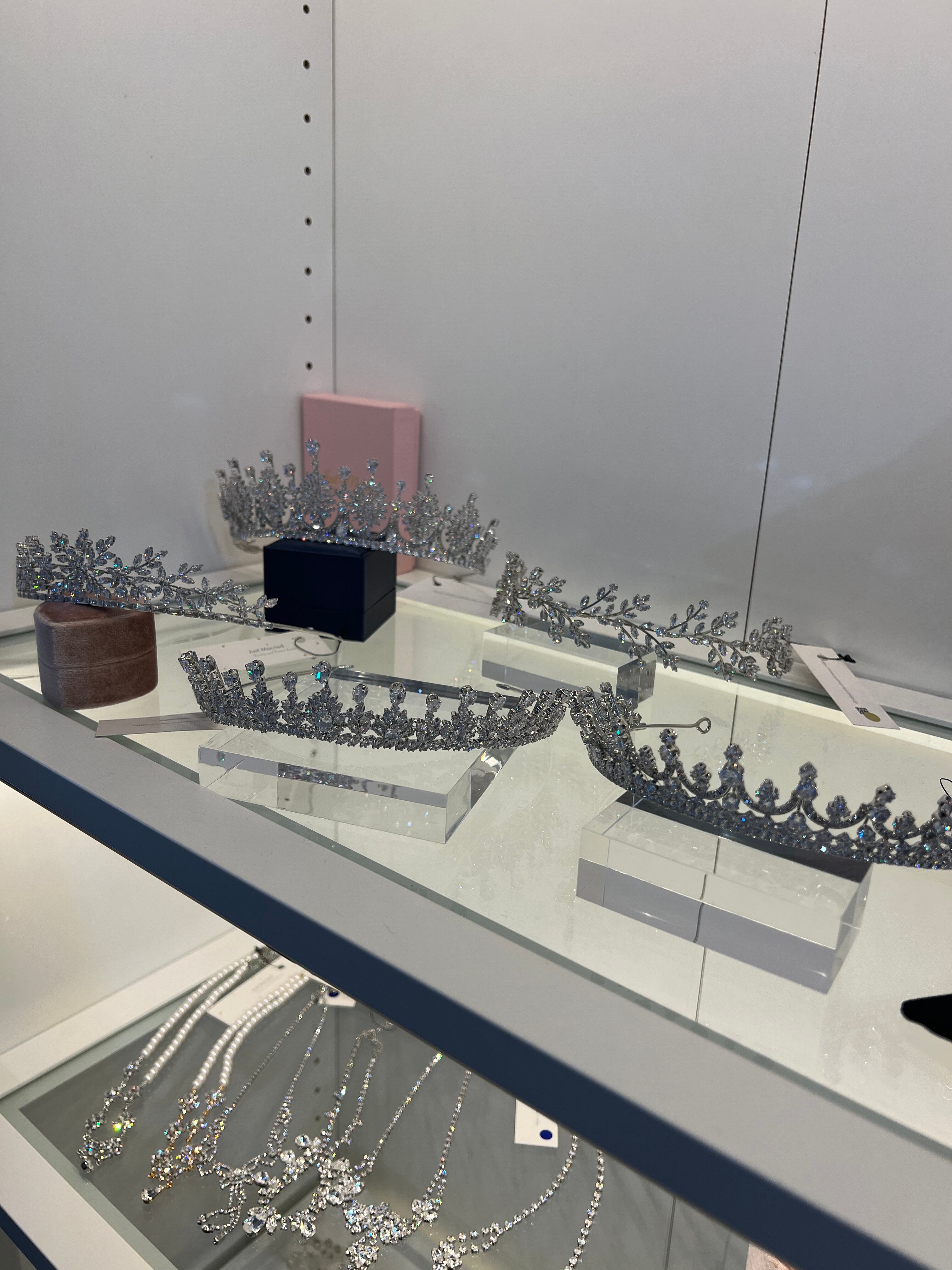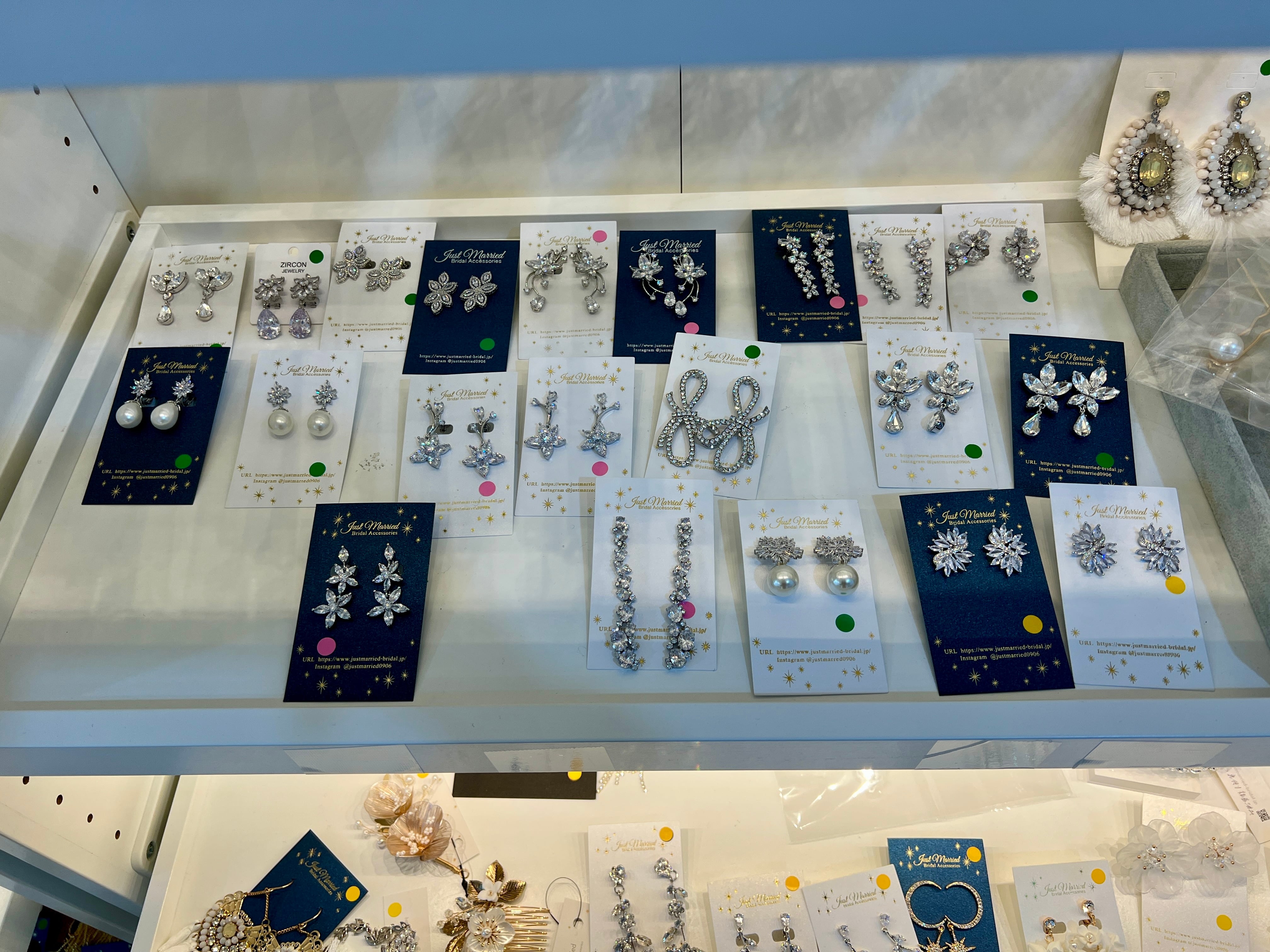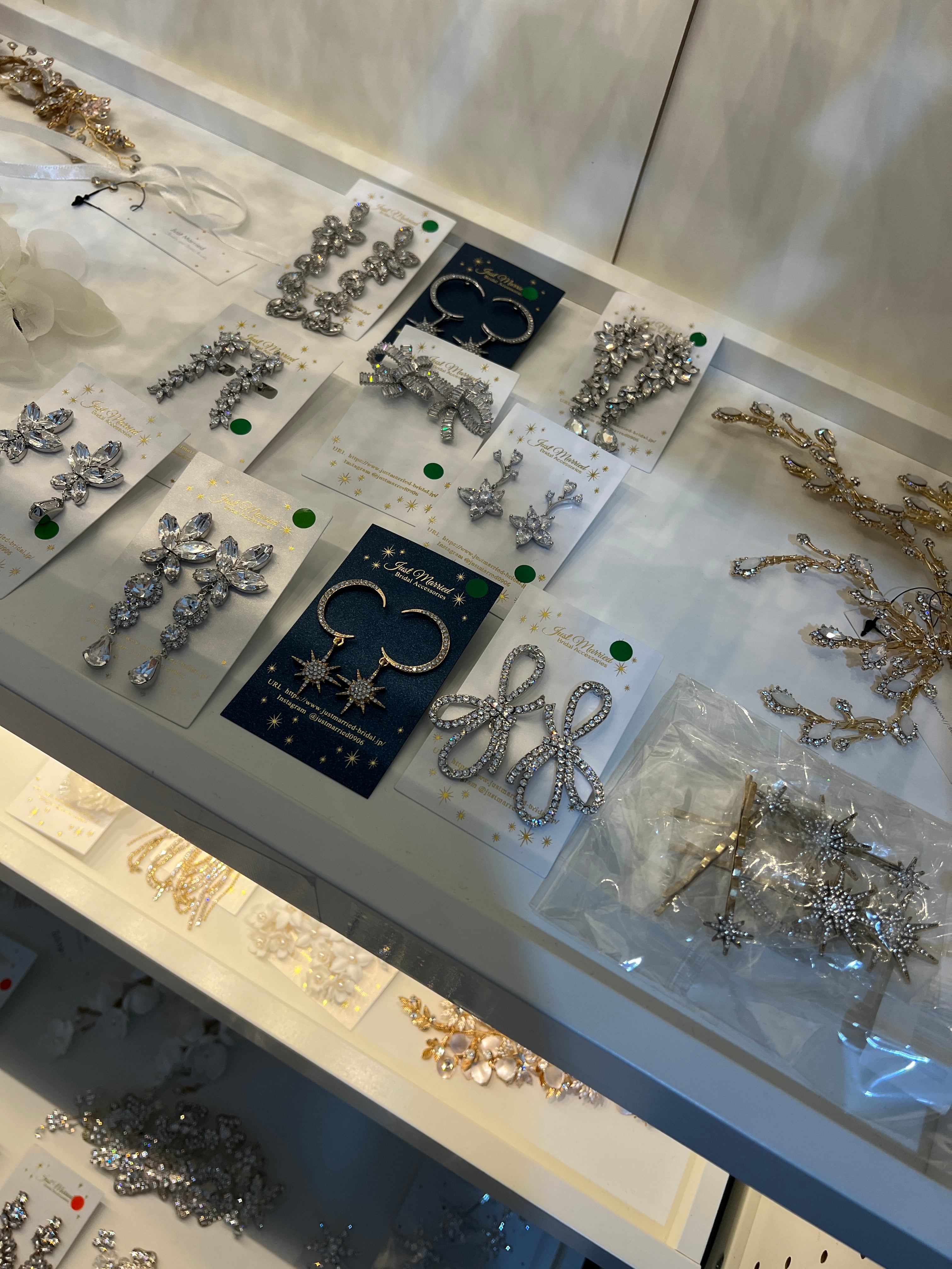 ティアラやヘアアクセサリー、イヤリング、ピアス、ネックレス等、Just Marriedの人気アイテム200点程度を六本木店舗で販売しています。