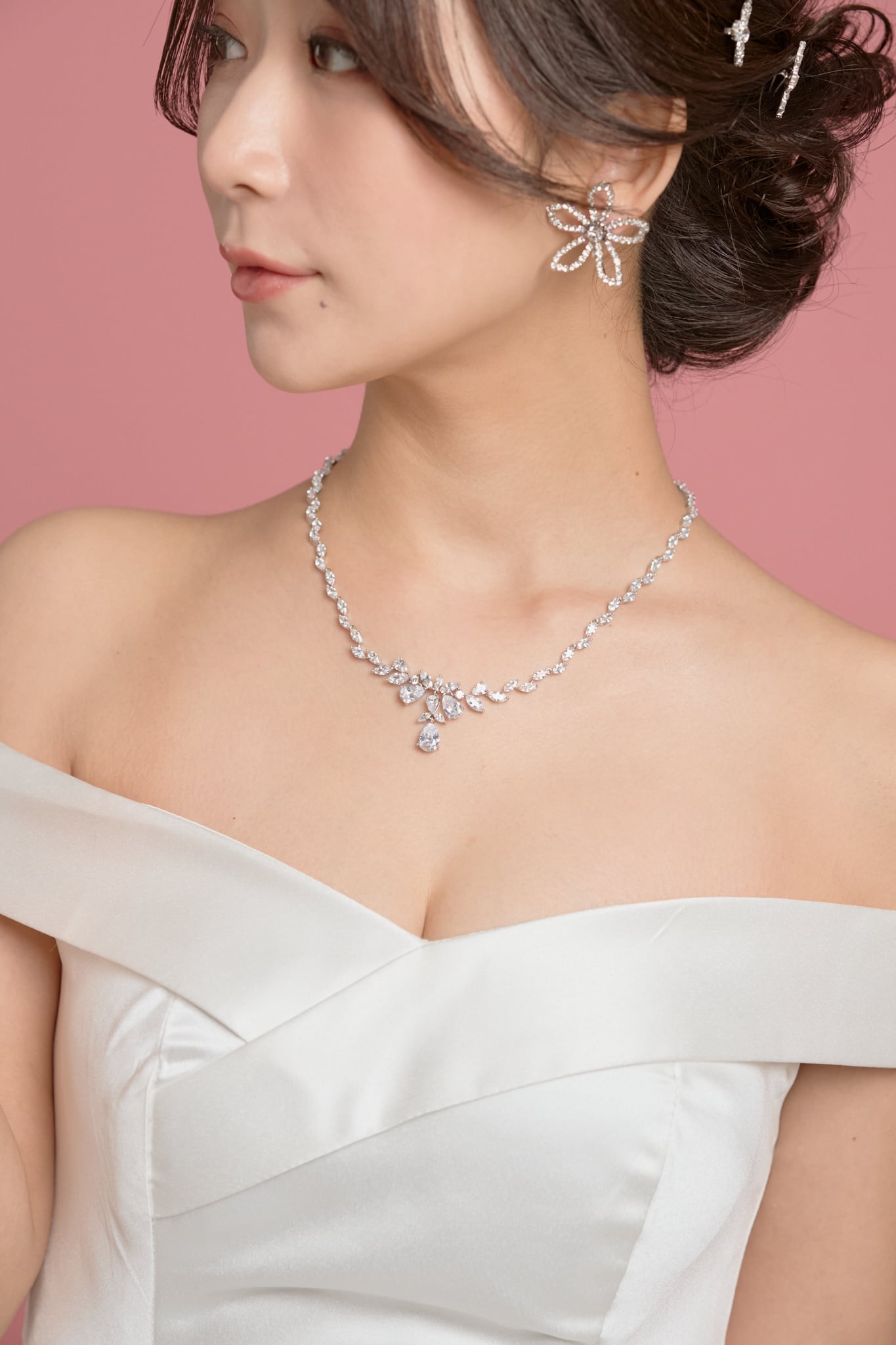 フローラルモチーフの繊細なデザインは様々なドレスに合わせていただけます。